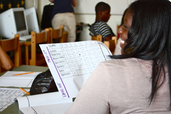 The design process really got going this week. The first task was compiling and analyzing the results of the survey from the previous week. With all the votes tallied, some strong priorities emerged: a running track and turf field, a new basketball court, plenty of areas for sitting and hanging out and enjoying lunch, and new play equipment like the spinner we saw at Herron playground. Then it was time to sit down and begin the hard work of laying out all these design elements using scaled basemaps and templates representing each of the uses. To start, we worked with the landscape architects to identify areas in the schoolyard where we could best manage stormwater, and then added garden areas to drink up the water. Students then decided where other activities should be located by moving the templates around on the map.