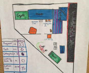After an introduction to the process and a discussion of the different components of the design processm, the students' first assignment was to create maps of the schoolyard from memotry to identify the most prominent features and common uses. Some classes did visual observations of current schoolyard activities (sports, socializing, painted games) and noted the age and gender of those involved in the different activities. They also wrote about their favorite playground activity.