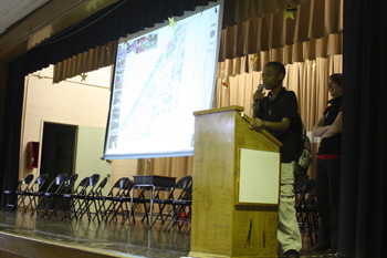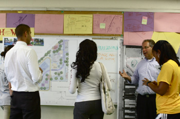 Students reviewing the concept plan created by the landscape architects; Students presenting design during school assembly; Landscape Architect, Stu Appel, presenting design at assembly; Students receive a Certificate of Participation in the Design Process. Credit: Danielle Denk, Sophie Sarkar. |
