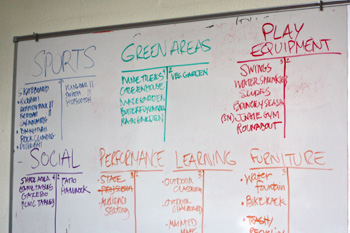 The ideas ranged from different kinds of active sports courts, hang out areas, running tracks, rain gardens, trees, game tables, water sprays, and new jungle gyms. Wells Appel helped the students refine their dreams with considerations of maintenance, safety and cost. (We all agreed that the roller coaster would be beyond our means.) This comprehensive list formed the basis of a survey that every student in the school completed at the end of the week. We also held a follow-up community workshop with parents and other stakeholders discussing desired uses, maintenance and safety considerations, and future programming.