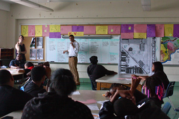 This was a busy week. We wrapped up the educative component of the design process, introduced the landscape designers, and began the physical design process. The week started with a final conversation about the various forms that schoolyard gardens could take. In the next session we invited the landscape architecture team of Wells Appel to participate in brainstorming sessions with each class. This was the students' chance to dream about the potential of the schoolyard and develop a comprehensive list of the various types of amenities and improvements we could make to the schoolyard.