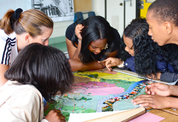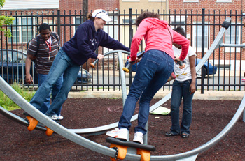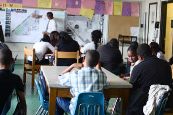 The Parks for People-Philadelphia program team, Simone Mangili and Danielle Denk, meet twice a week with students in grades 6-8 to discuss various aspects of site and playground design, learn about current users and uses, play and green infrastructure elements, and work through site plans. Upon completion, the kids will have developed a schematic design for a safe, green playground that's for fun them and smart for the city.