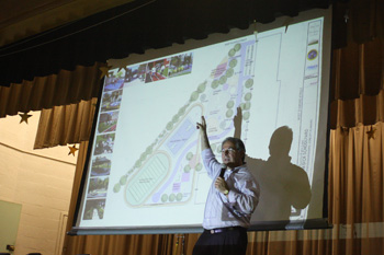 The Wells Appel team returned Tuesday with a concept plan that integrated the most popular design elements from the previous classes and the latest refinements. Wells Appel presented this design to the students for their final review and analysis. In addition to a running track wrapping around the synthetic turf field, the concept included a larger running track encircling much of the rest of the site. Here are some of the other elements in the final design: